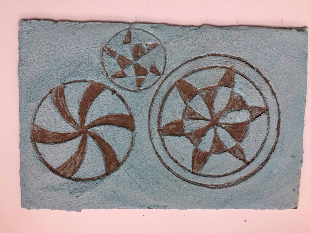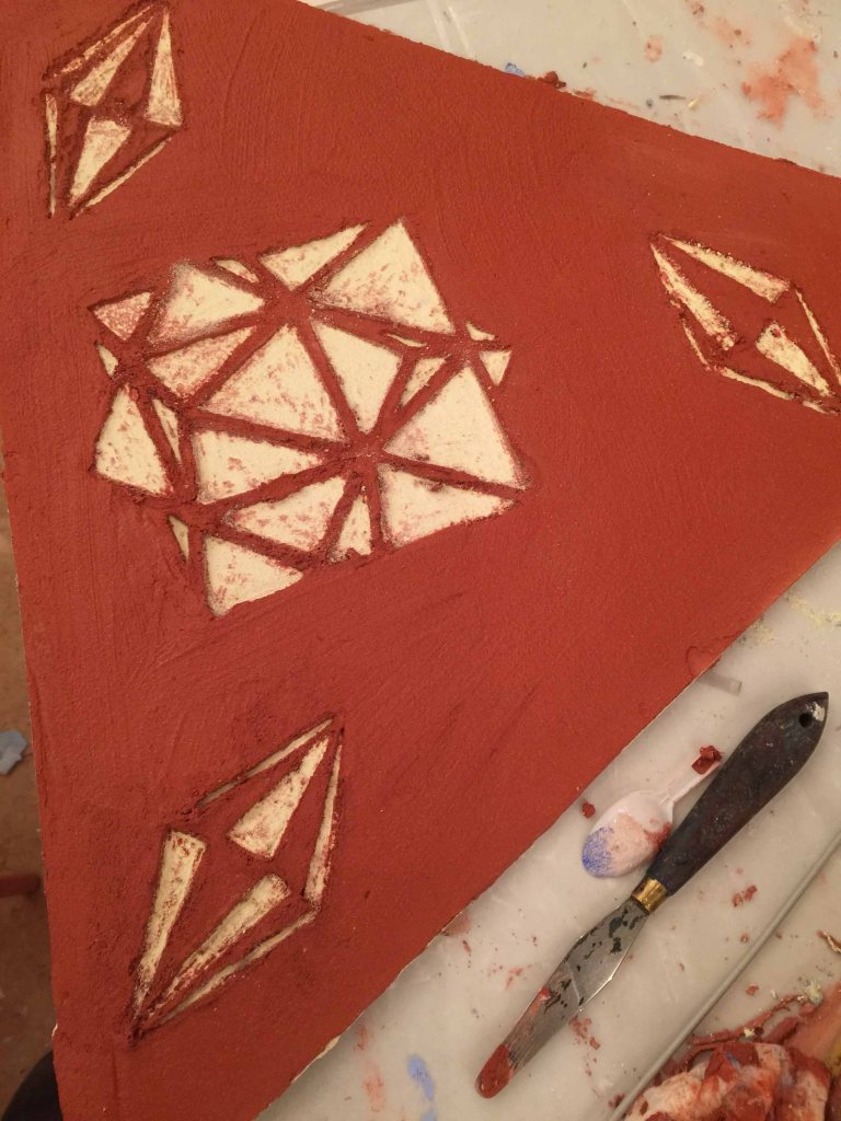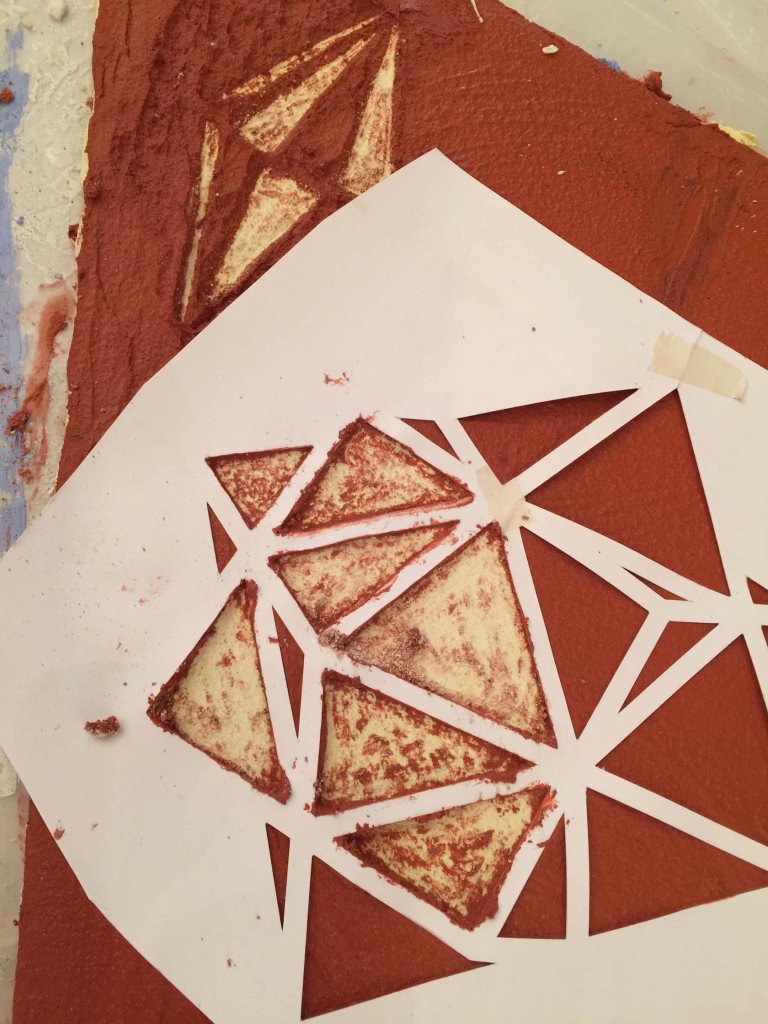 Für Sgraffito an Aussenfassaden eignet sich Kalkzementputz in der Körnung von 0.2mm. Bei kleine Flächen ist es sehr praktisch eine Schablone zu verwenden, die hier mittels Vektorgrafik gecuttet wurde. Zum Einfärben wurden Pigmente verwendet. Eine andere Möglichkeit ist den Unterputz mit Kalkmilch zu überstreichen und die Zeichnung nur dünn auszuschaben. Das ergibt aber nicht die gleiche Licht -Schattenwirkung , wie beim Kalkzementputz. Auf alle Fälle sollte der Helligkeitskontrast von Ober- und Unterputz schon was her machen.